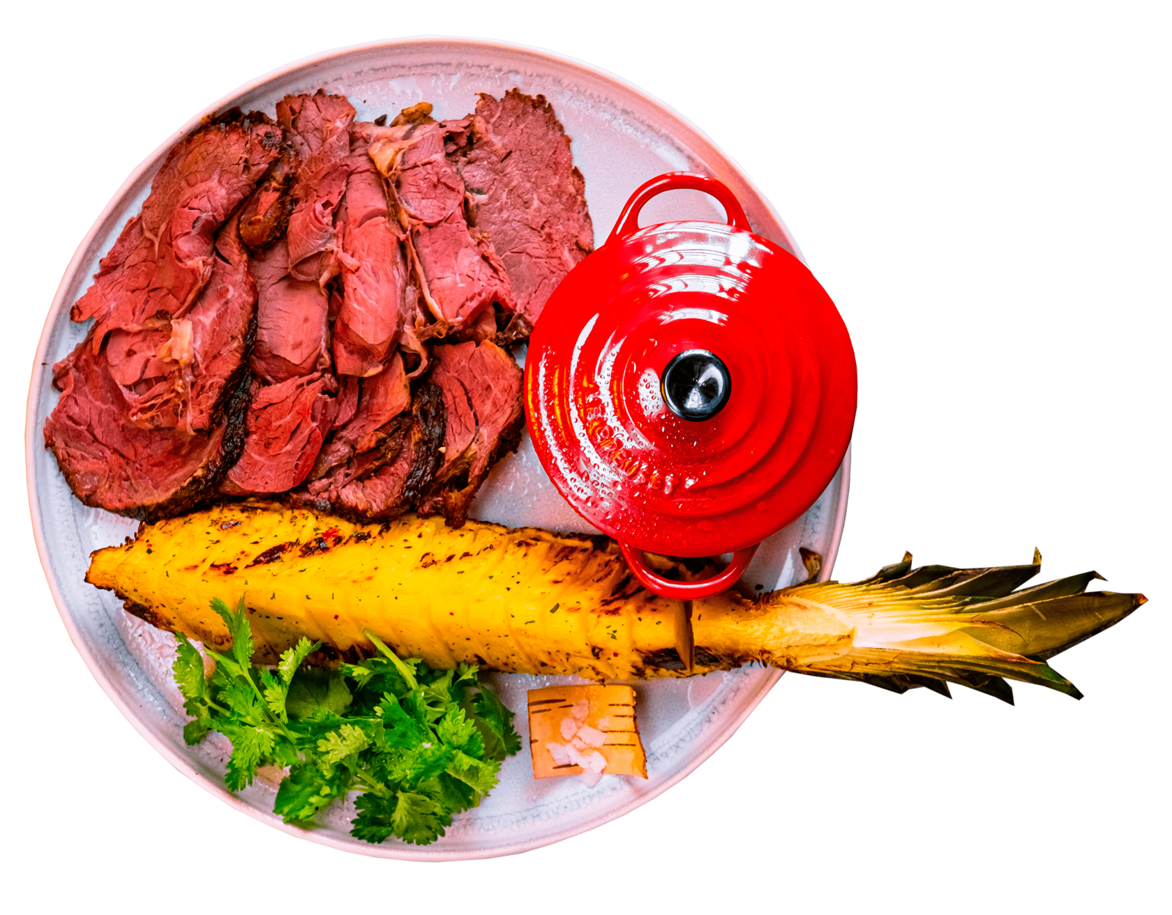 Мясо на кости, весом в 12 кг маринуется неделю. Готовится на углях, вместе с ананасом.